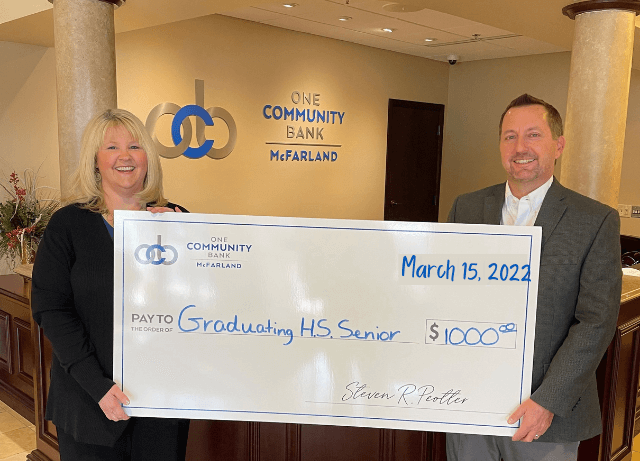“One Community Bank is very proud to launch the 2022 scholarship program.” Steve Peotter, President and CEO stated, “Supporting the continued academic growth of young adults who have a dedication to their communities is a great way to give back.”