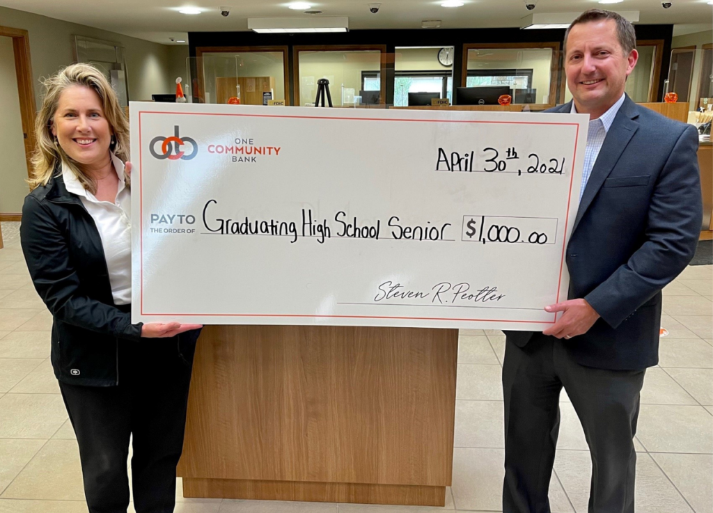 “One Community Bank is very proud to launch the new scholarship program.” Steve Peotter, President and CEO stated, “Supporting the continued academic growth of young adults who have a dedication to their communities is a great way to give back.”